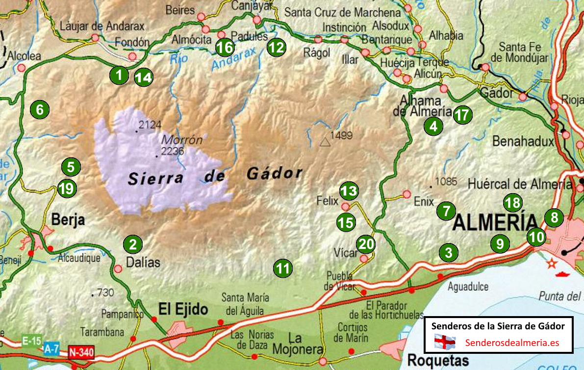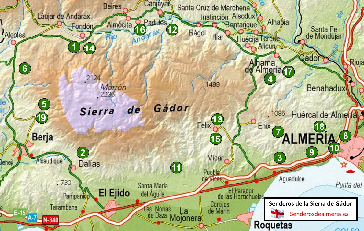 Mapa de senderos en la Sierra de Gádor, en la Región de Almería: