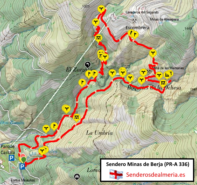 El sendero Minas de Berja (PR-A 336) comienza en la parte alta del área recreativa de Castala, en el término municipal de Berja. Para llegar hasta allí, debemos:
