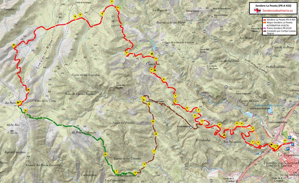 • En el mapa y en el track de Wikiloc, encontrarás una ruta circular opcional: desde Aljibe Alto puedes bajar por el sendero PR-A 120, y tras los Caracolillos, seguir por la Vereda del Caballar hasta el Cortijo de Cuevas Negras. Desde aquí, subir al Majano y regresar al punto de partida por el tramo final del Sendero de la Peseta. El recorrido total serían 27,4 km.